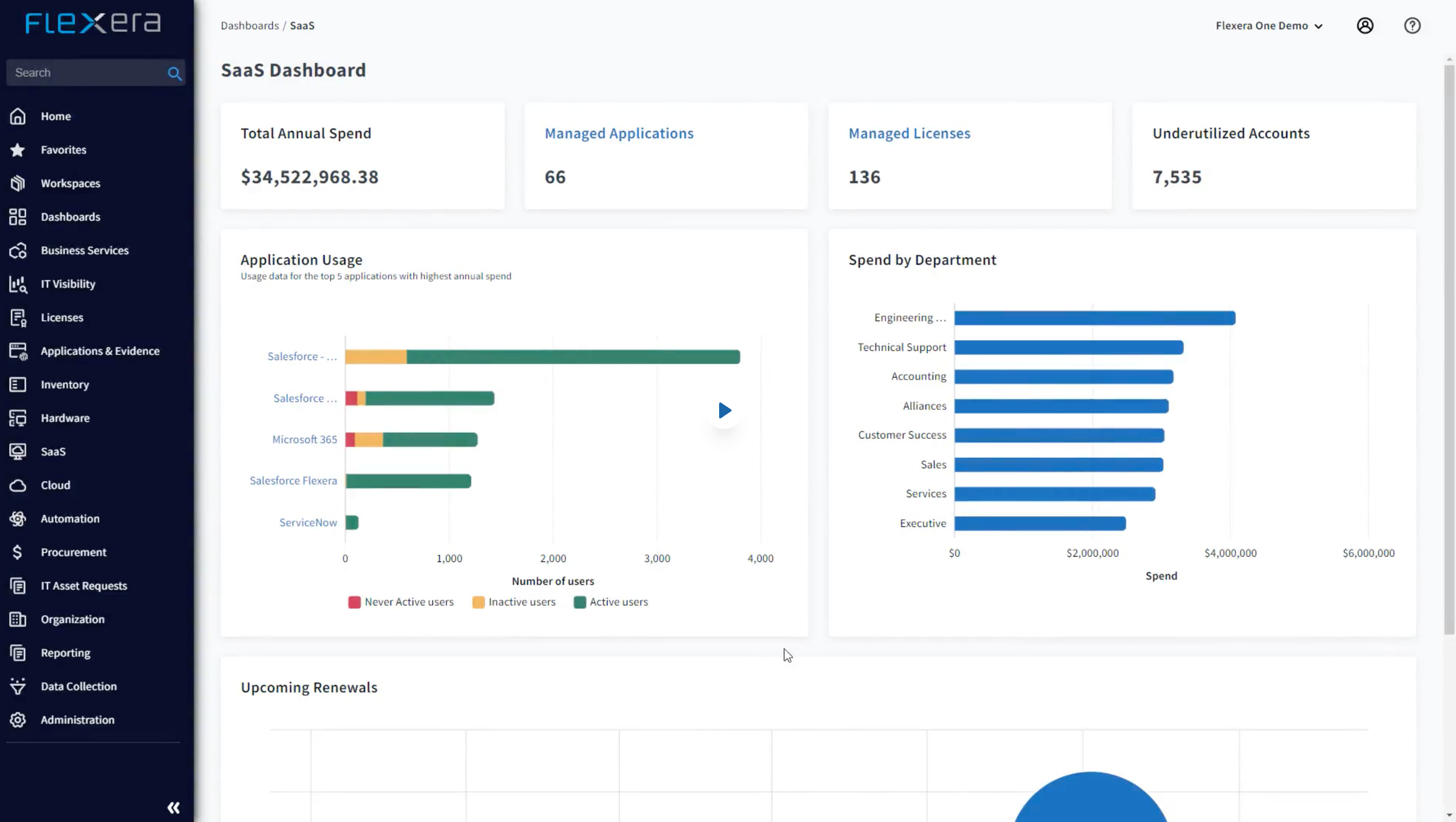 The ease of adopting SaaS has led to explosive growth in application usage, but it has also created significant challenges in managing costs, security and compliance. Flexera SaaS Spend Management solutions provide the complete visibility you need to discover all sanctioned and unsanctioned (shadow IT) applications, optimize subscriptions based on actual usage and turn your SaaS portfolio into a well-managed strategic asset.