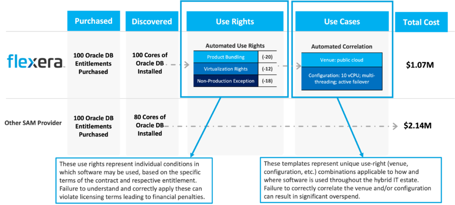 Flexera has deep, vendor-specific licensing expertise and a comprehensive product use rights library, enabling automated calculation of complex license positions for vendors like Oracle, IBM, Microsoft and SAP, ensuring compliance and identifying savings.