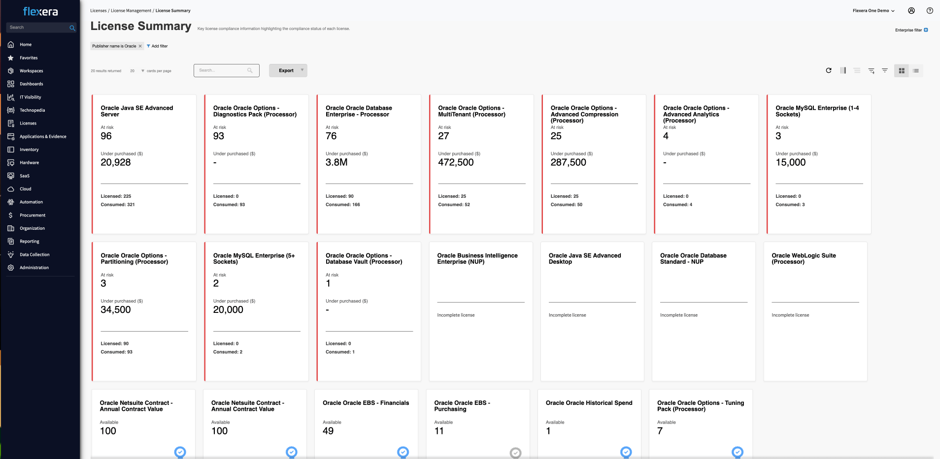 Enterprise application licensing is very complex. Without proper visibility, it’s hard to understand if licenses are configured correctly to optimize spend or if features (such as Oracle Management Packs and Database Options) are enabled but not being used. To save time and simplify the complex, leverage a product use rights library that automatically optimizes your software portfolio by applying product use rights such as upgrade, downgrade, second use, non-production, active/passive cluster, virtual and hybrid use rights.