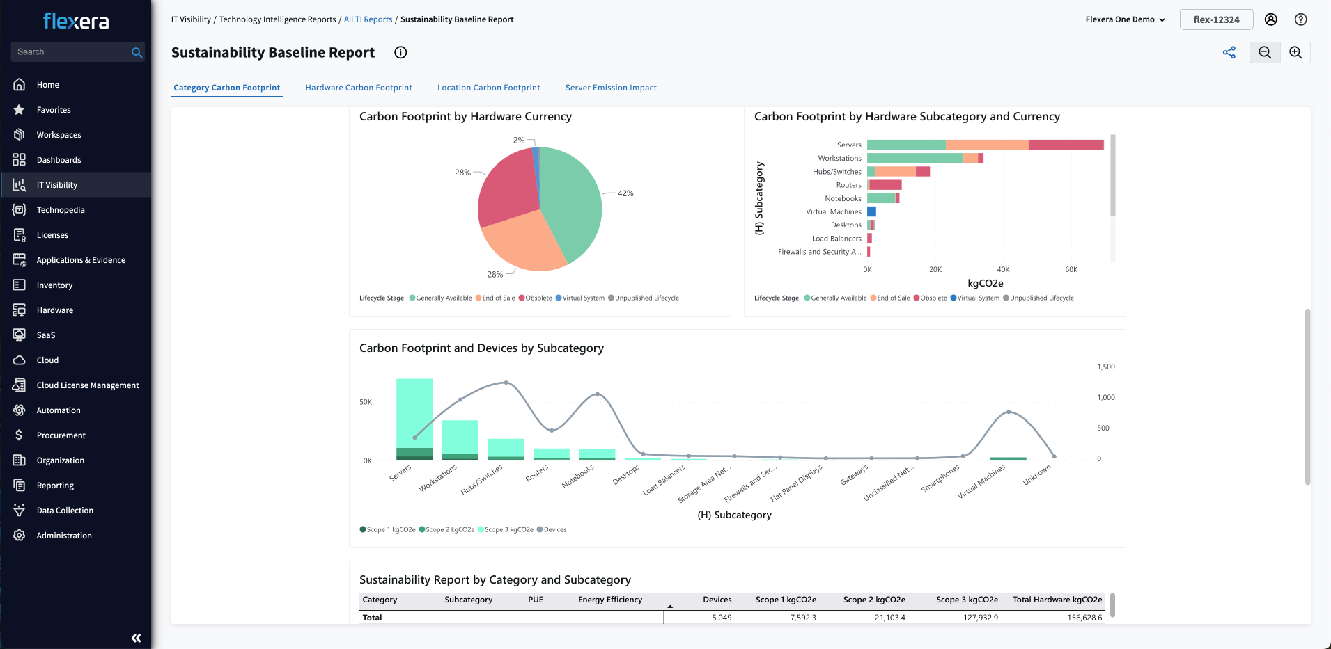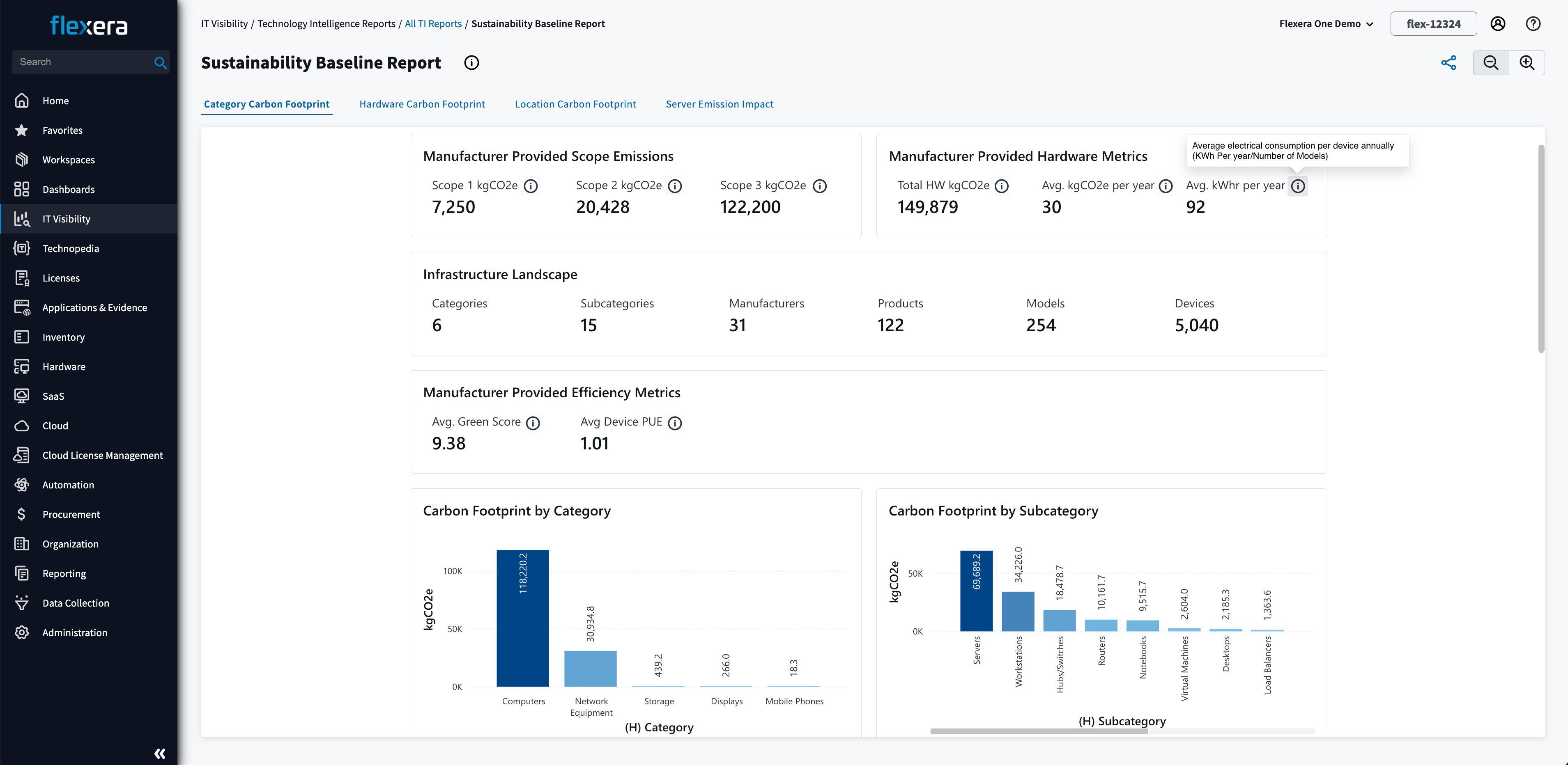 The increasing complexity of hybrid IT environments makes IT sustainability challenging. That’s why IT teams require reliable data to make key ESG decisions. From desktops (laptops, workstations, and peripherals) to servers, Flexera focuses on measuring and analyzing your emissions across Scope 1, Scope 2 and Scope 3 to determine your carbon footprint's factors.