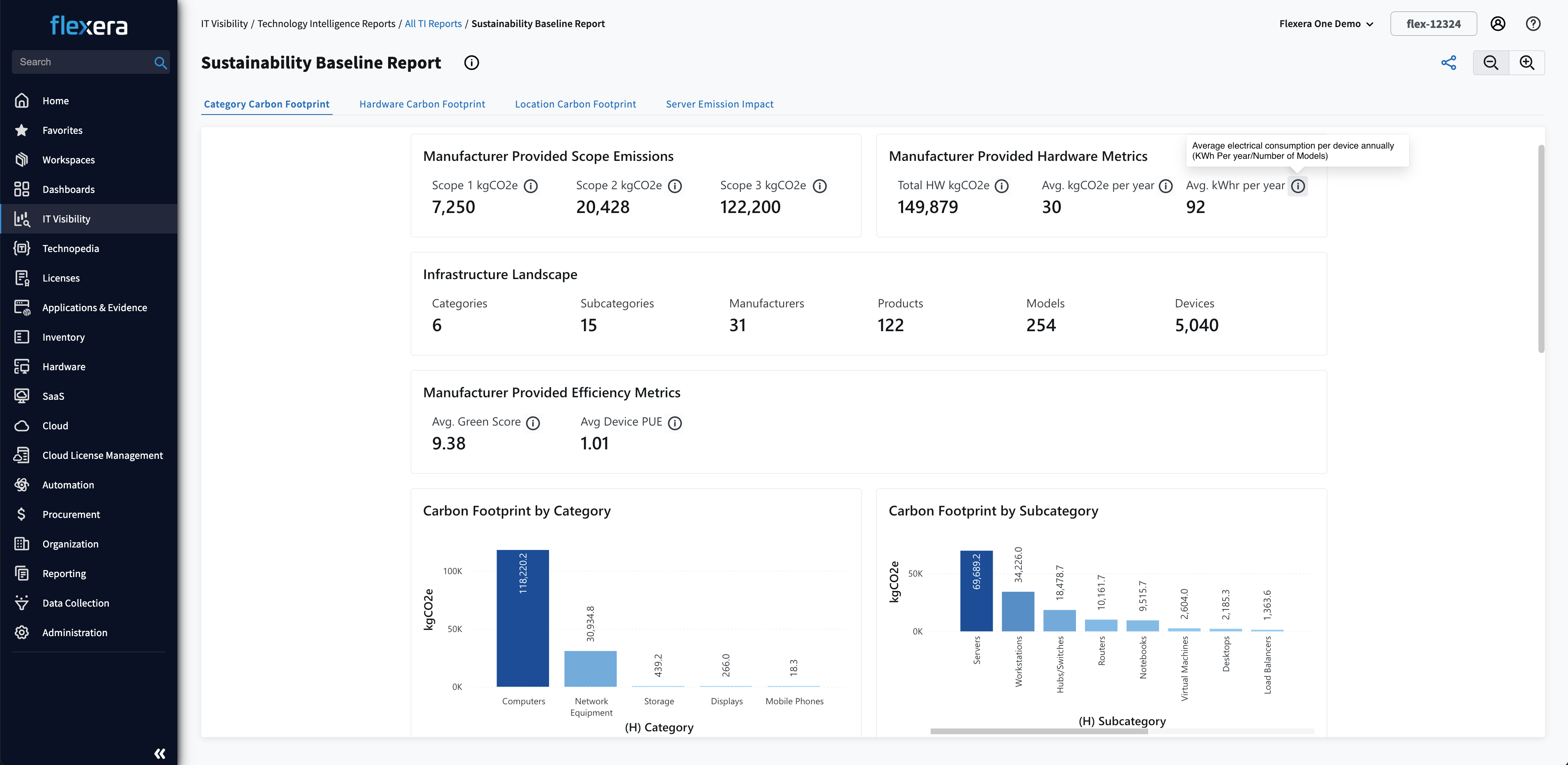 As sustainability regulations increase, enterprise organizations are prioritizing ESG initiatives and sustainable IT efforts. Flexera supports these goals by offering insights powered by Technopedia, the leading technology data reference catalog, to help organizations build and maintain sustainable IT measurement.