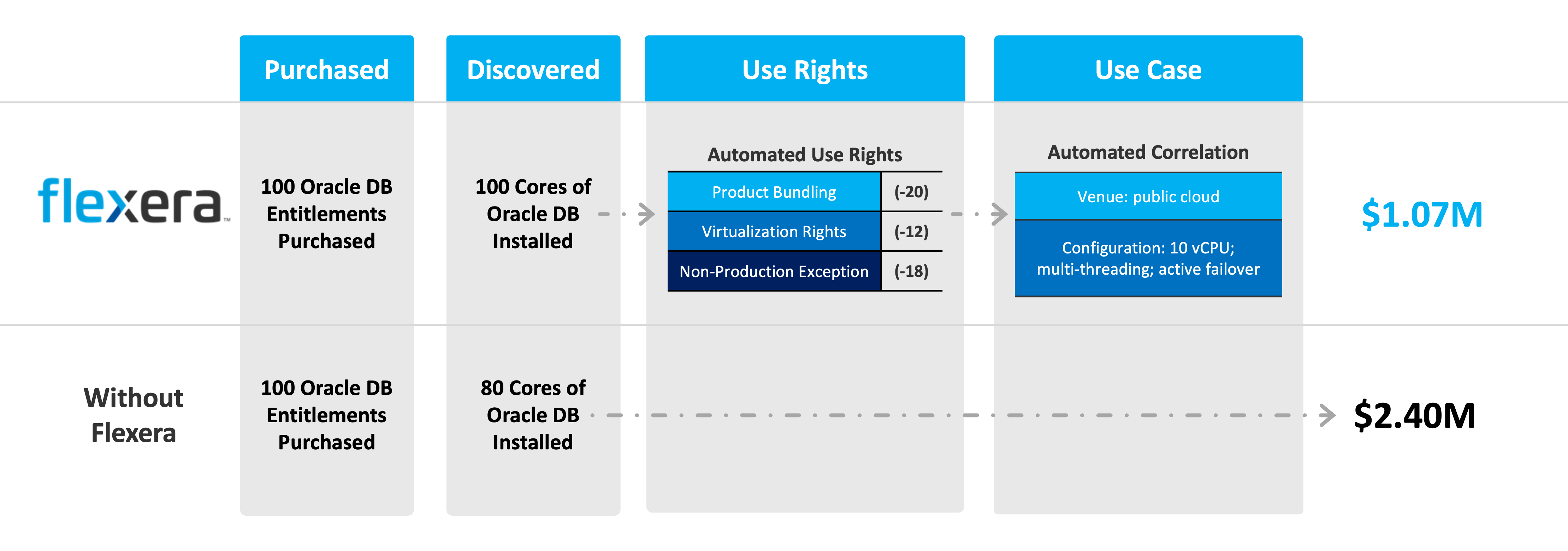 Stop paying for more than you need and achieve an accurate effective license position (ELP) with Flexera. We are the only solution that can automatically discover the correct product use rights based on the licensing options that Oracle offers.
