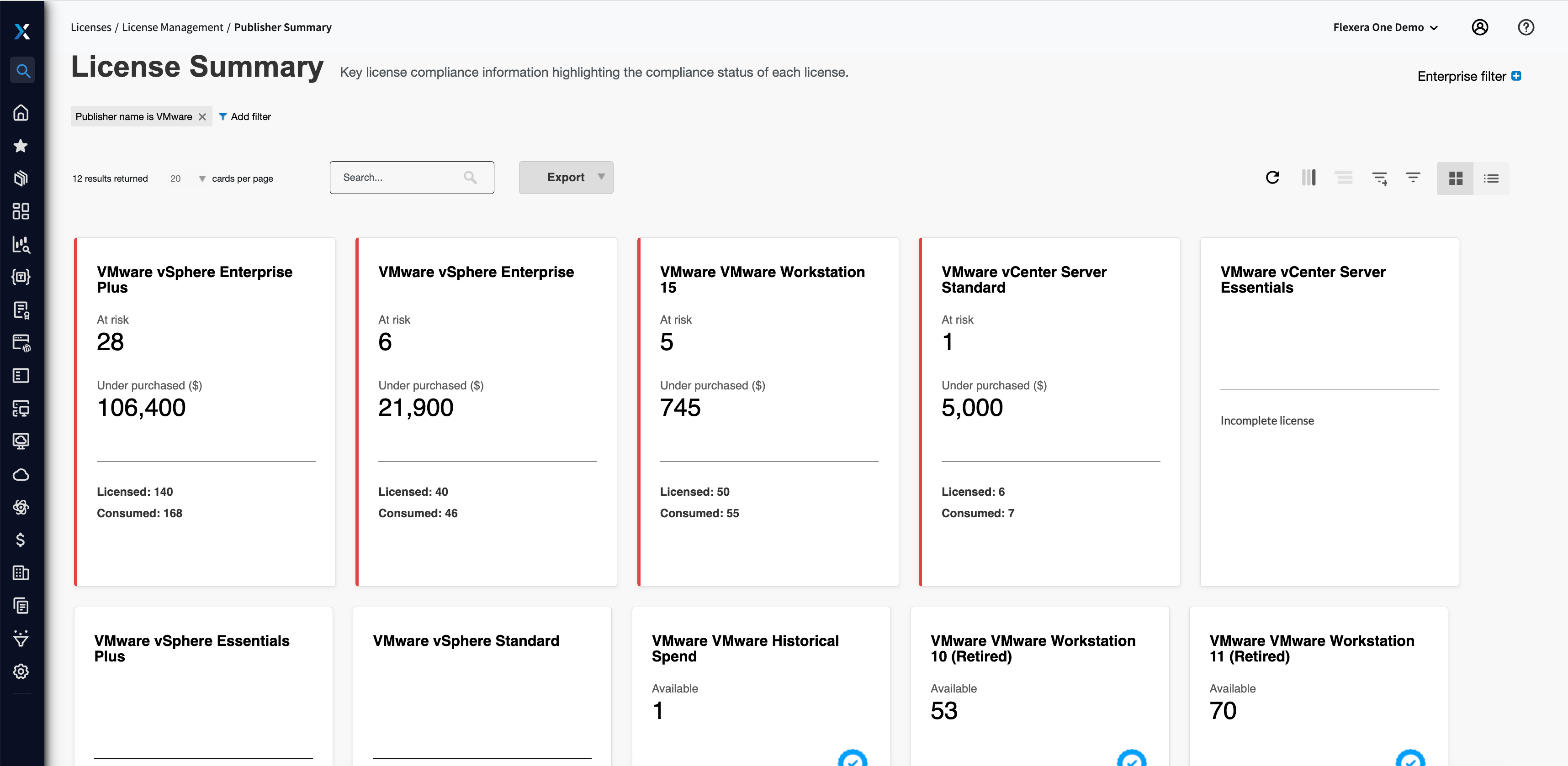 With massive changes for VMware licensing by Broadcom, IT professionals will need to understand their VMware license position and assess the financial impact on their business. Flexera provides an overview of your organization's spend, licenses purchased and product use rights. For each application you can drill into the compliance position and usage details to understand what licenses are required by the business.